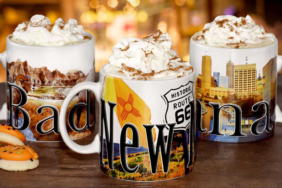 We offer mugs in a wide range of styles for locations across the United States. From ceramics with sketch art and relief lettering to copper “mule” cups and travelers, our souvenir mug lines has something for everyone.