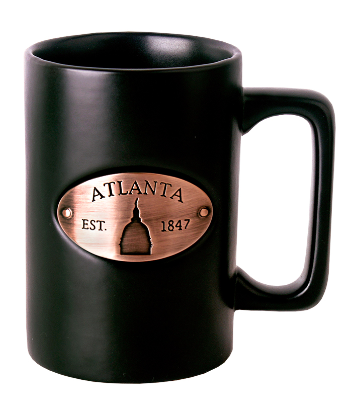 The Black Matte Copper Medallion Mug holds 15oz of your favorite beverage and features a Copper Medallion with an Atlanta graphic located on drinkers right side of the mug. The black matte mug must be hand washed and is not microwave safe, dimensions are Height 5 inches, Width 3.25 inches and Depth 3.25. Weight is 1lb 4oz..